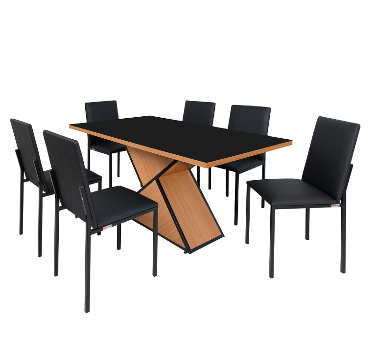 Conjunto de Mesa Egito com 06 Cadeiras Dubai Tampo de Vidro Tubo Fosco 160cm Preto/Freijó/Linho – Ciplafe
