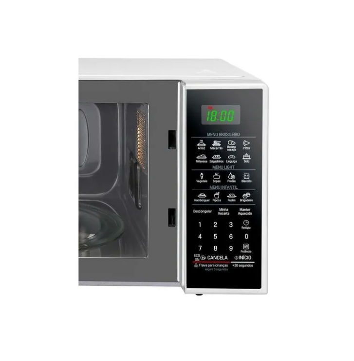 | Funções Extras | 16 receitas pré-programadas (Menus: Brasileiro, Light, Infantil), 4 modos de descongelamento, função “Manter Aquecido”, relógio digital, “+30 seg”, trava para crianças |