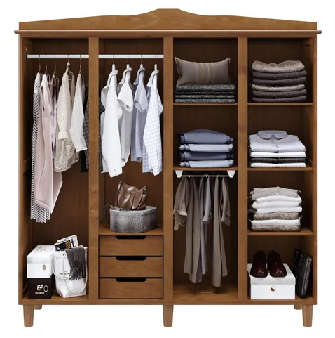 O cabideiro em madeira de alta resistência e o calceiro em metal oferecem suporte seguro para roupas e calçados. Feito em madeira de pinus reflorestada e acabamento em poliuretano fosco, o móvel garante durabilidade, resistência e fácil manutenção. Seus puxadores e pés em madeira completam o design clássico e sofisticado, tornando-o um destaque no quarto.