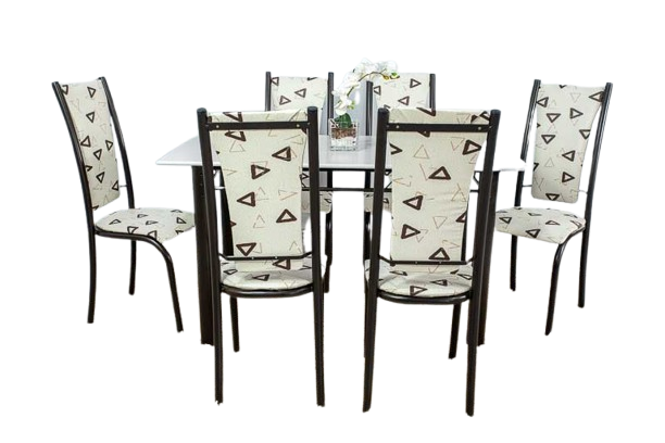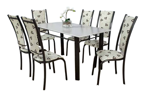 Cadeiras | Quantidade: 6 unidades Modelo: Mônaco Estrutura: Aço tubular pintado Assento: Estofado em tecido liso ou estampado Altura: Aproximadamente 105 cm Suporte Máximo: 110 kg por cadeira |